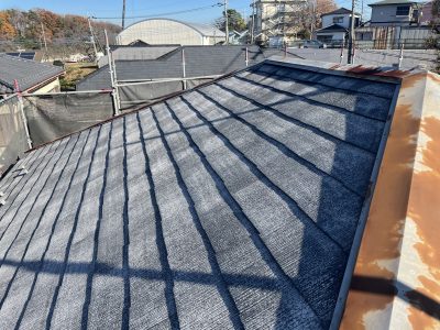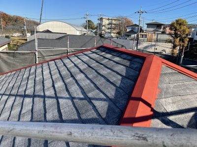 屋根板金に錆止めを塗りました。ケレンをしてから錆止めを塗る事で錆が出るのを防ぎます。下処理をする事で長持ちします。します。